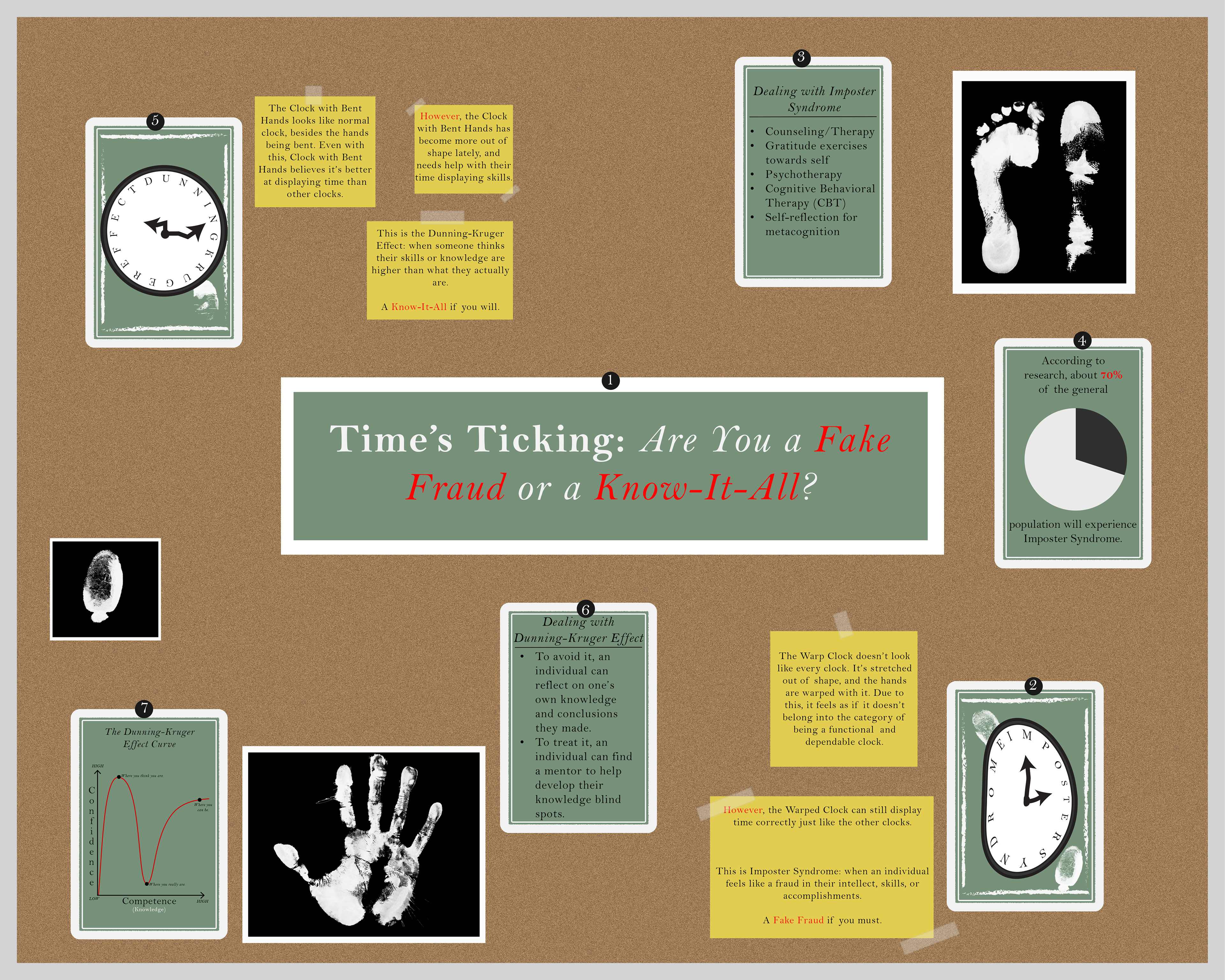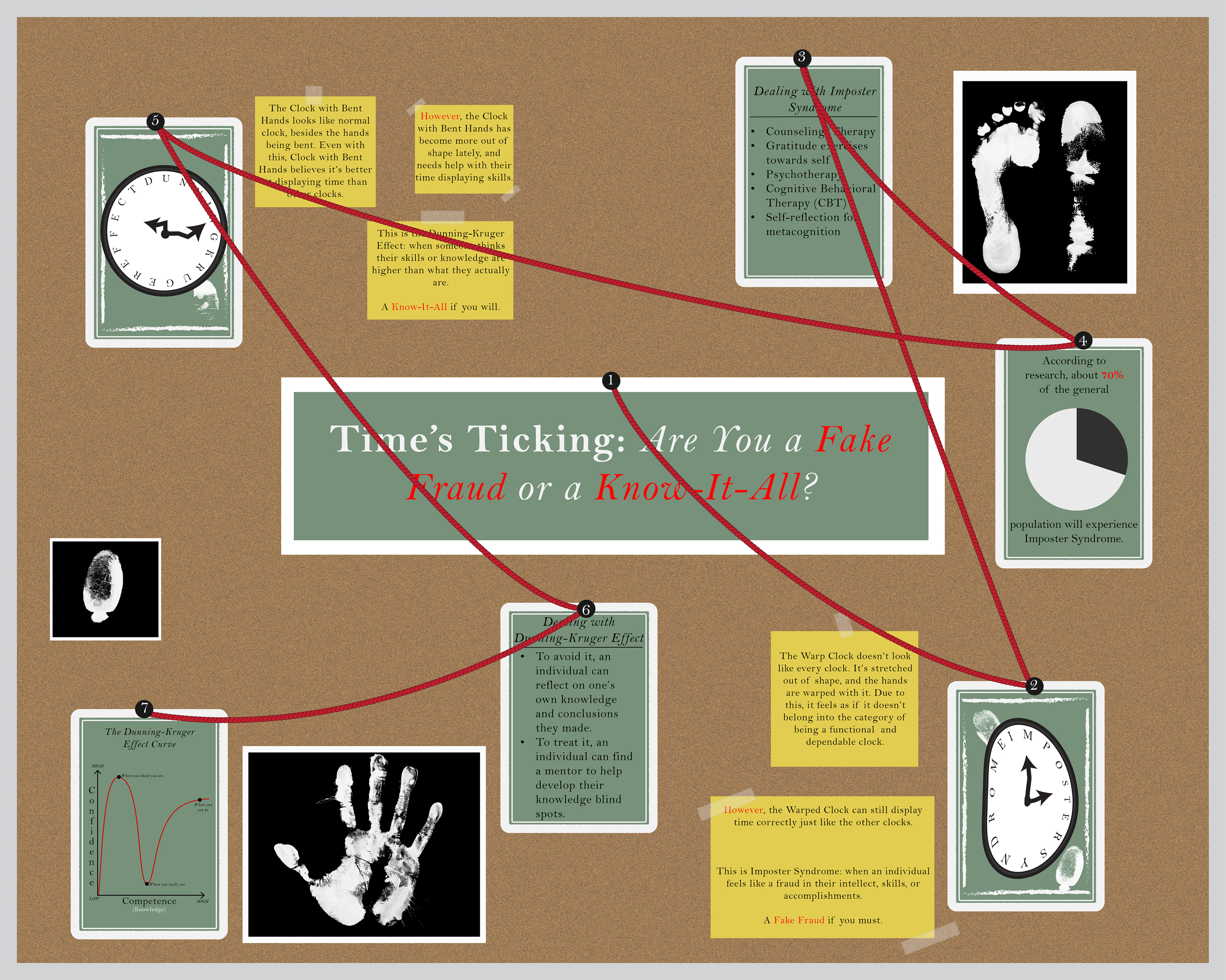 For this project, use a format that displays your strengths and goals to showcase the ideas and effects of Imposter Syndrome and the Dunning-Kruger effect. Photoshop and Illustrator were used in this project.